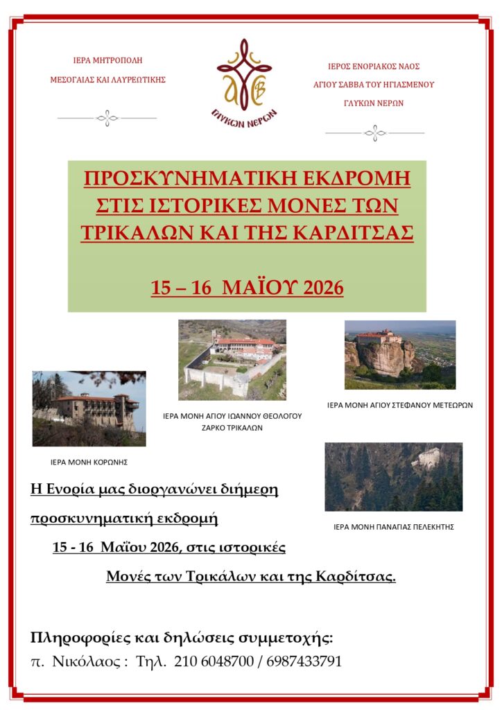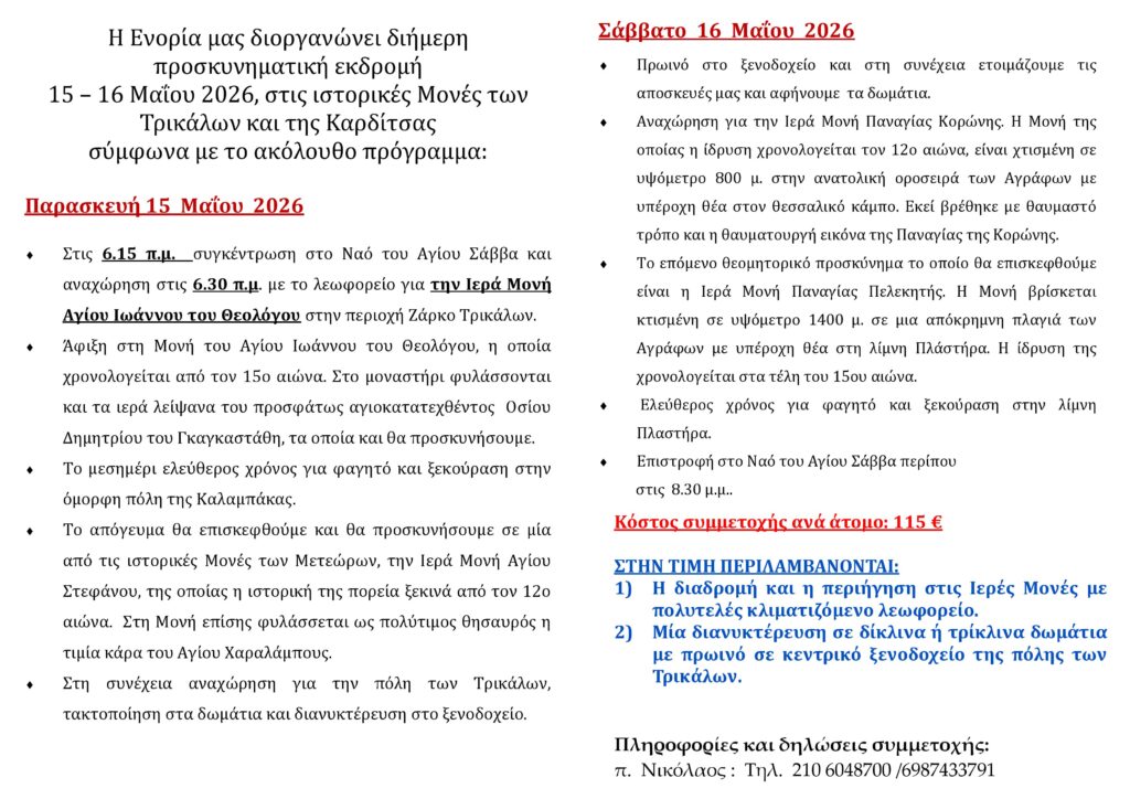 ΔΙΗΜΕΡΗ ΠΡΟΣΚΥΝΗΜΑΤΙΚΗ 15-16 ΜΑΪΟΥ 2026 ΣΤΙΣ ΙΣΤΟΡΙΚΕΣ ΜΟΝΕΣ ΤΩΝ ΤΡΙΚΑΛΩΝ ΚΑΙ ΤΗΣ ΚΑΡΔΙΤΣΑΣ Post published:April 21, 2026 Post category:ΕΚΔΡΟΜΕΣ / ΠΡΟΣΦΑΤΑ ΝΕΑ